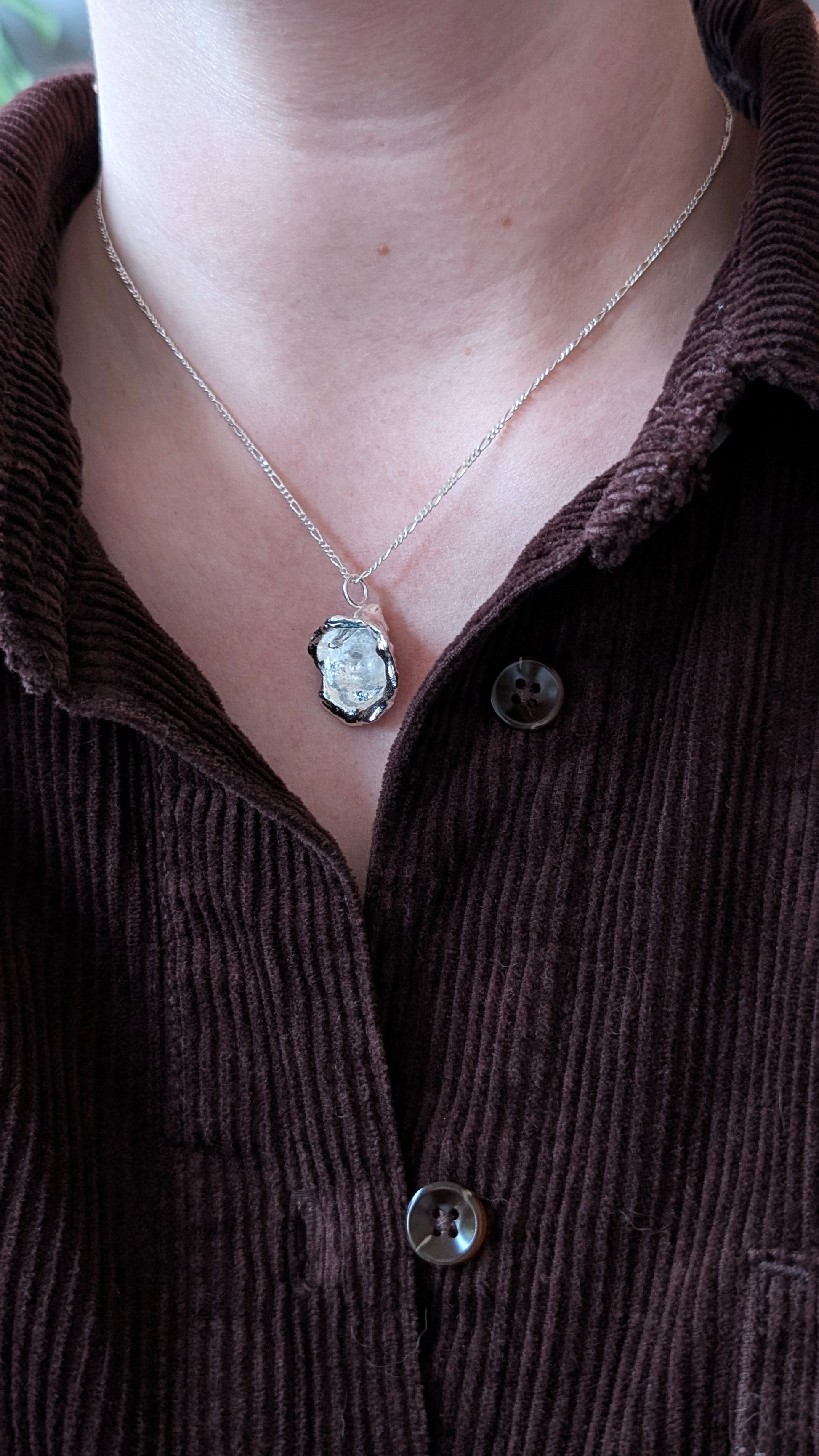 These pendants are made by melting recycled sterling silver and pouring directly into water, to create unusual organic shapes. Each one is completely unique and can never be recreated!